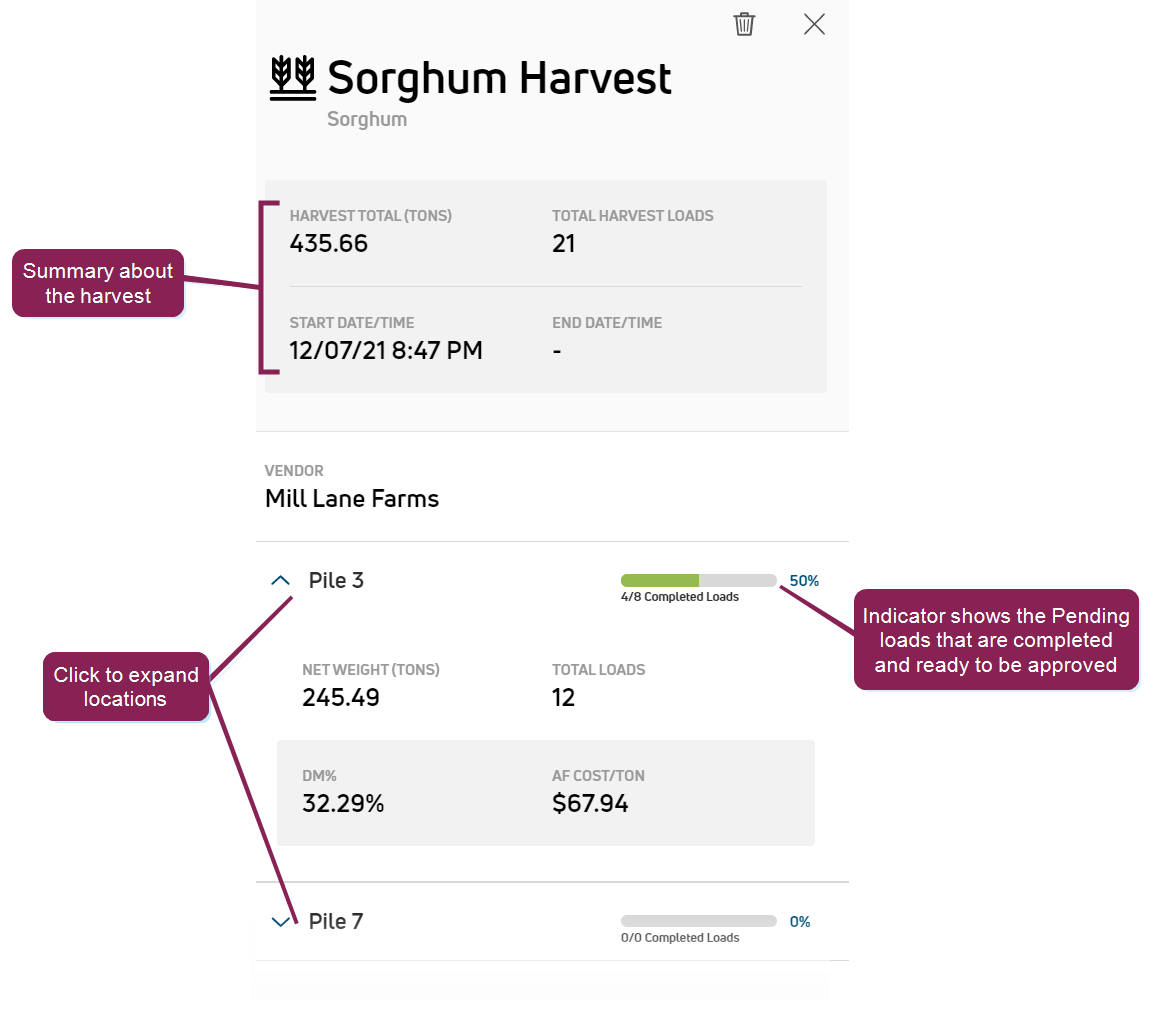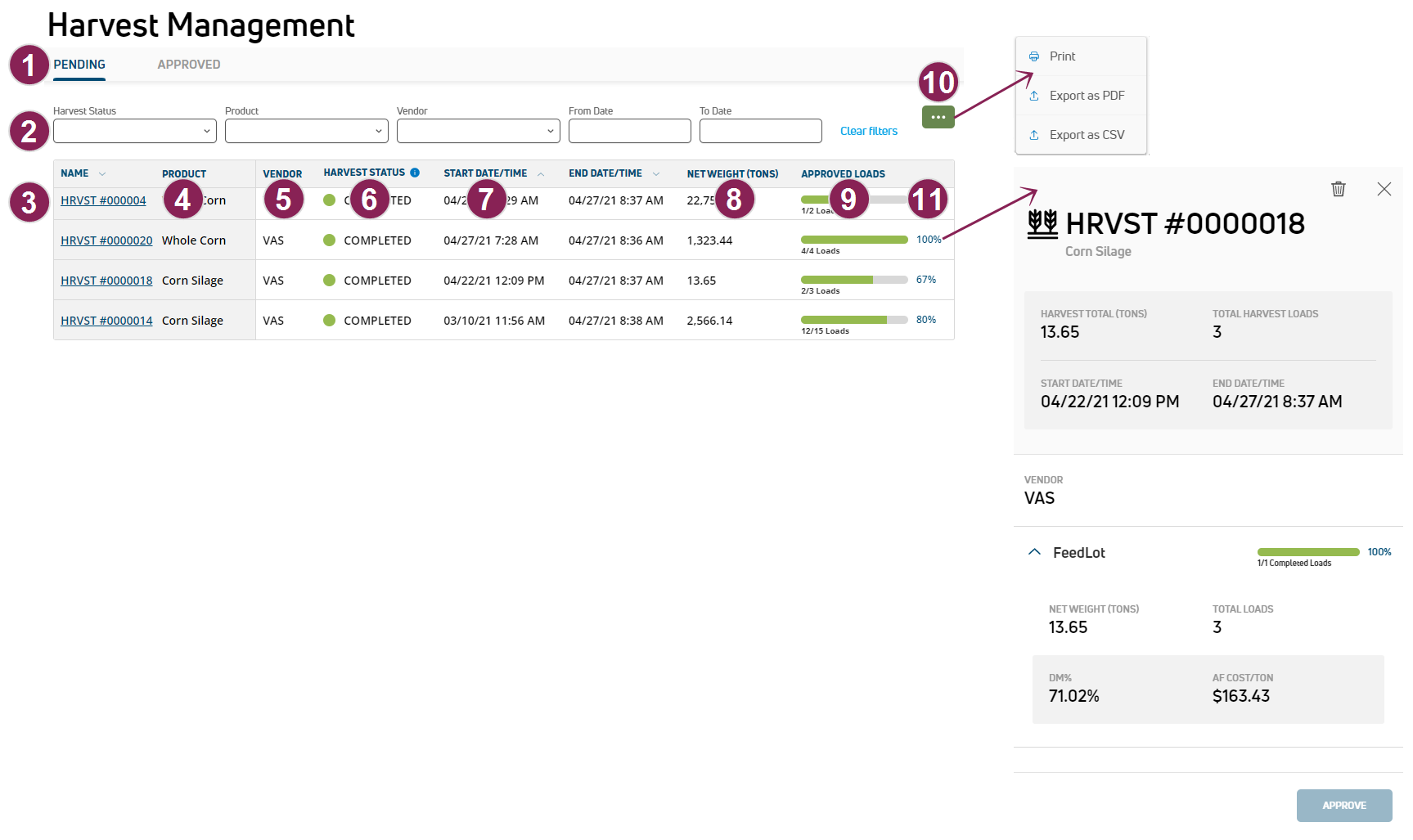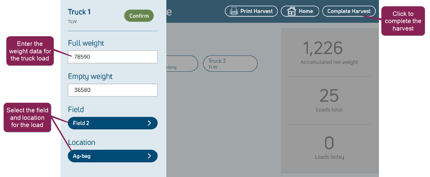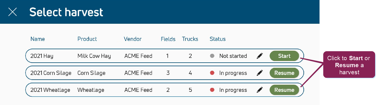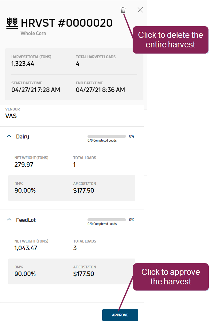 The Harvest Management feature allows you to manage all of your dairy's harvests. Each new harvest is created in the WeighComp app, and data for each harvest load is captured on the app by a scale attendant. The harvest can then be viewed and managed in PULSE.
