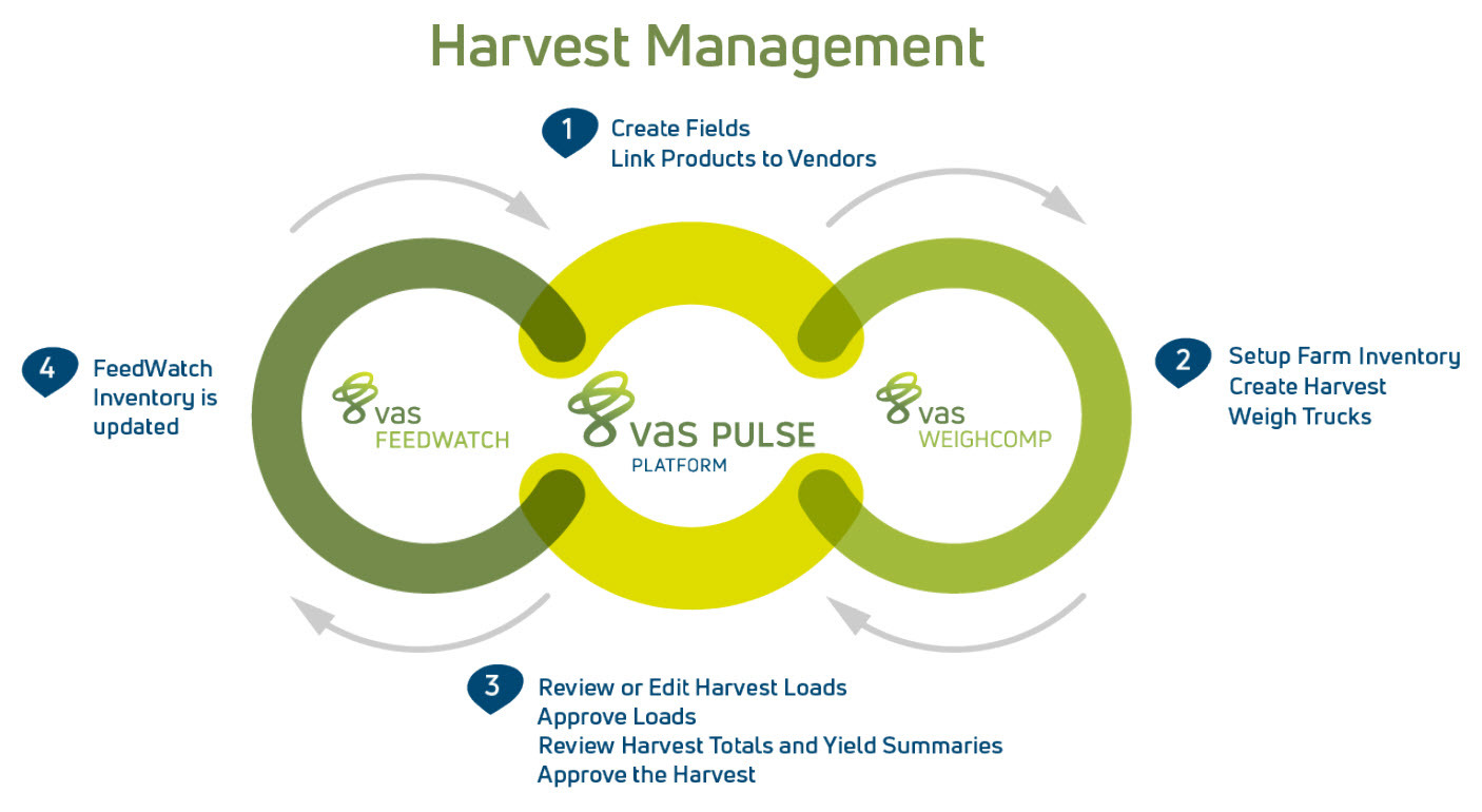The relationship between WeighComp, FeedWatch (on-premise), and PULSE for harvest management is shown in the following diagram.