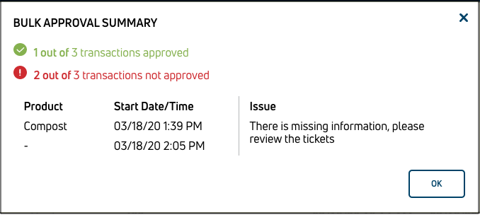 The system displays a new window summarizing the numbers of the transactions that were approved and/or failed the approval process. The window also shows product and timestamp information for the transactions that failed to be approved.