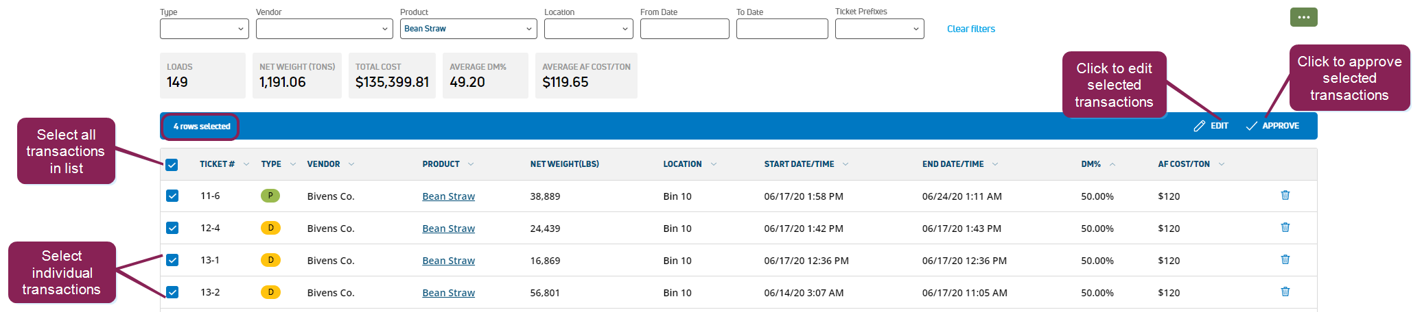 You can edit/update multiple pending transactions at the same time, provided that they all have the same product (for example, Corn Silage). (Remember, you can filter the transaction list using the Product filter at the top of the list.)