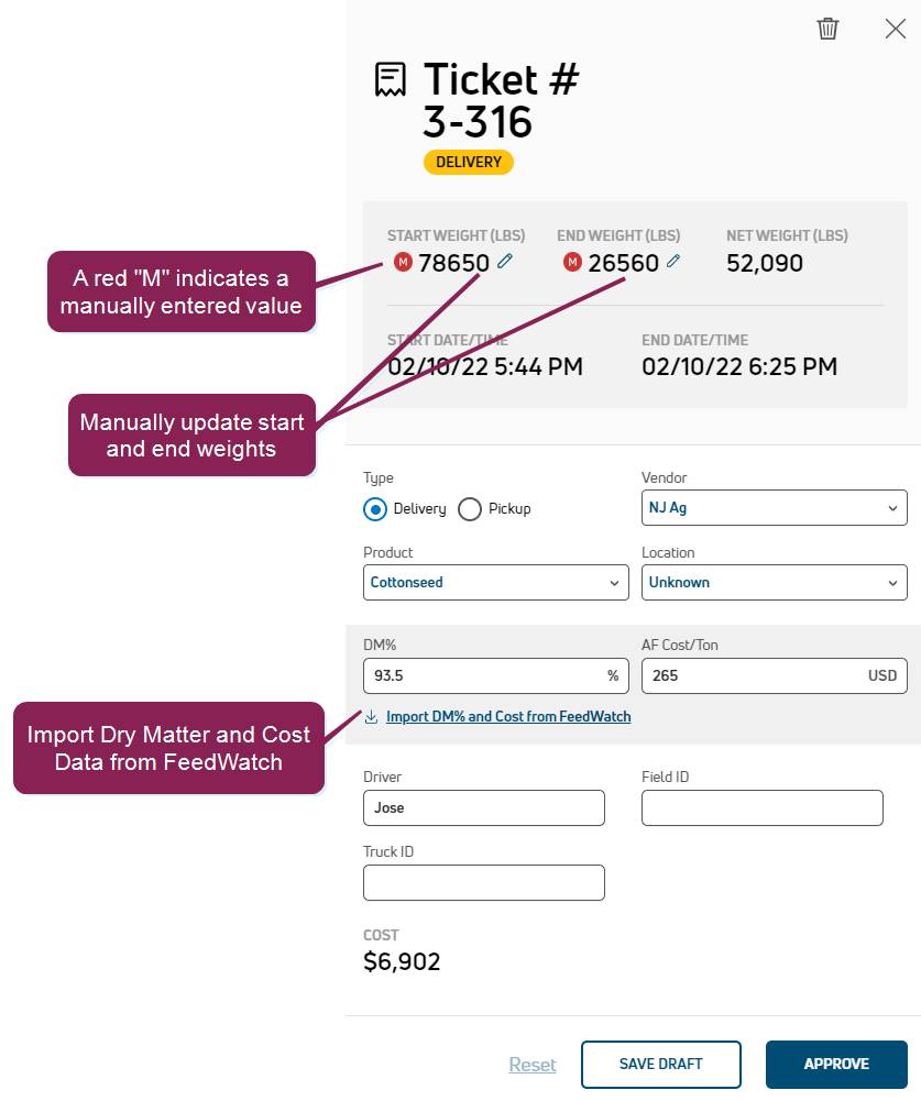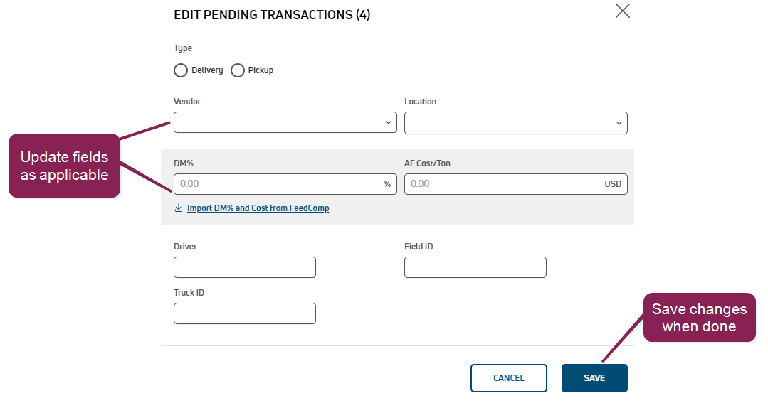 You can import the dry matter percentage (DM%) and cost data for a pending transaction directly from FeedWatch. Doing so provides the most current data available for those values (which can be viewed from the Ingredients page). Dry matter and cost data can be added to individual transactions, or to multiple transactions using the bulk edit feature.