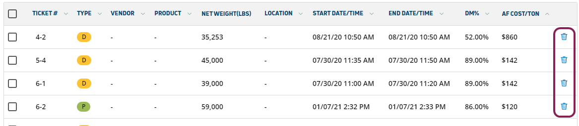 As‑fed cost per ton: The cost of the product involved in the transaction. - Delete icon: Click the delete icon