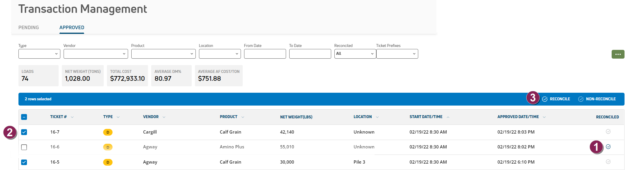 Reconciling a transaction is a way to note that an approved transaction has been reviewed in PULSE. This is an optional step to electronically verify that the desired loads for a product were actually brought to (or picked up from) the dairy.