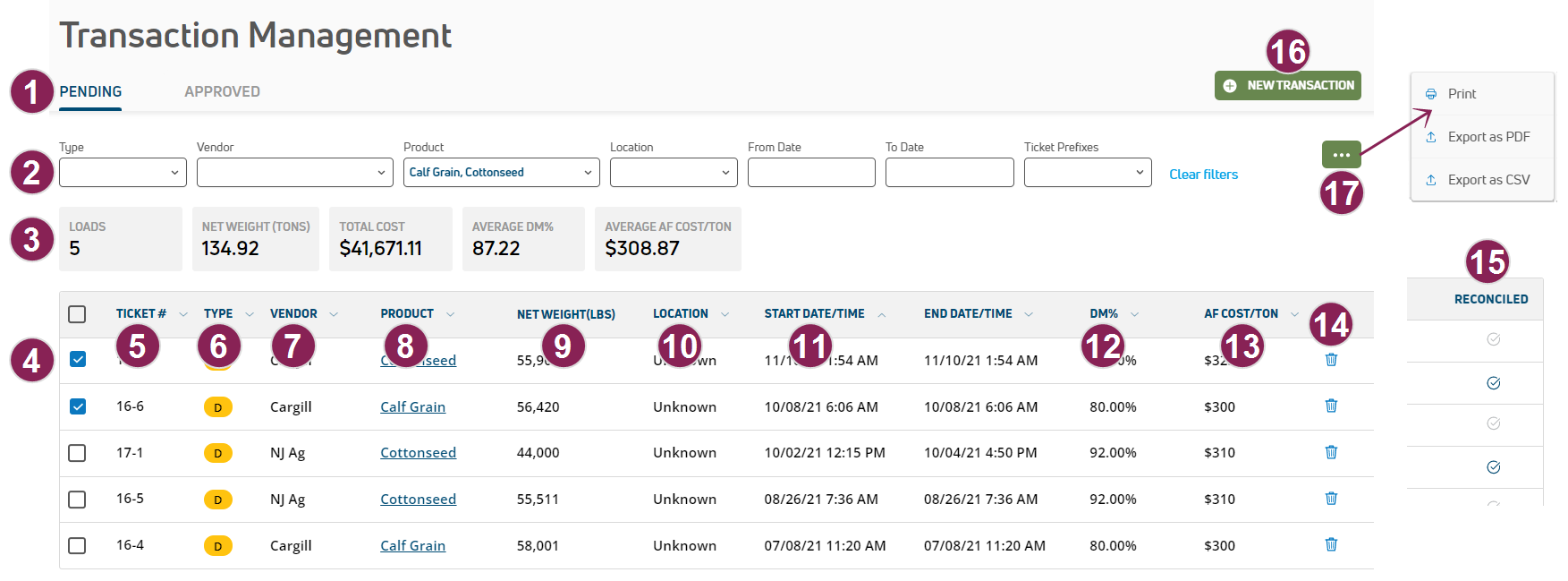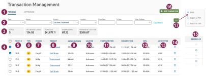 - Pending transactions are those that have been completed through WeighComp but have not yet been reviewed and approved.
