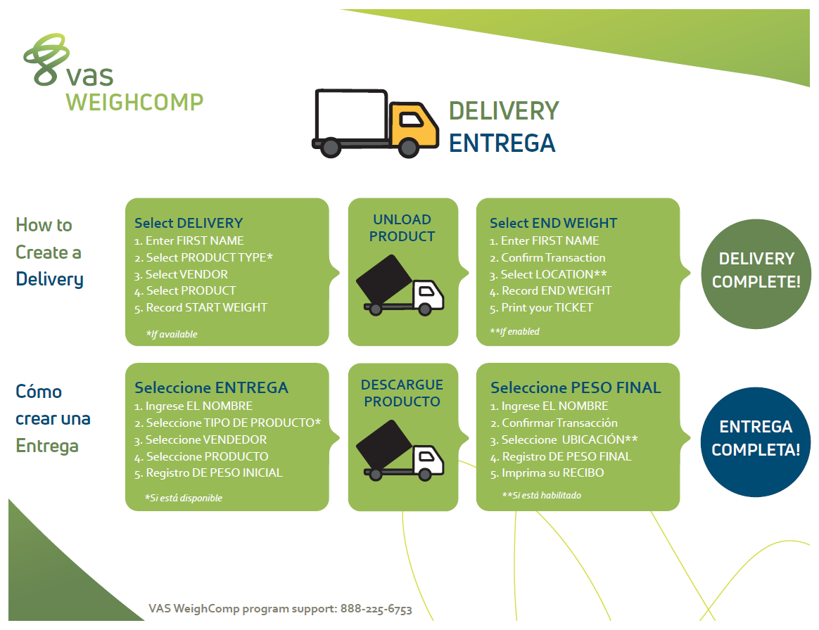 Data entry for spot load transactions is done via the WeighComp app by the truck driver, whether the transaction is inbound (a delivery) or outbound (a pickup). Additionally, authorized users can enter transactions directly on WeighComp in VAS PULSE Platform. However, the WeighComp app provides a step-by-step interface so that truck drivers can easily record deliveries and pickups of feed inventory. Once a transaction is completed in the WeighComp app, the data is sent to PULSE.