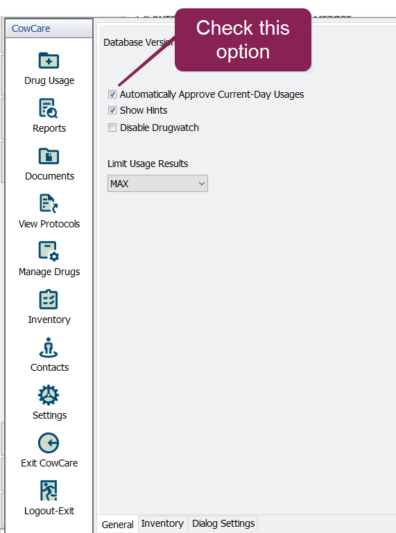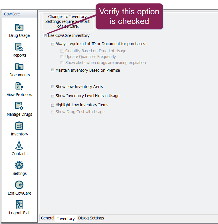 in DairyComp 305. - Check the Use CowCare Inventory option on the Settings > Inventory tab: