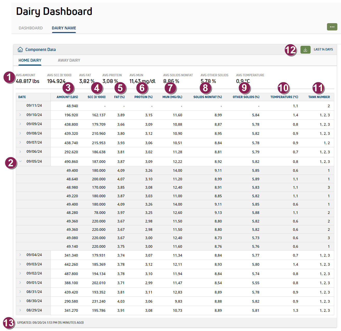 The Milk Quality widget includes milk delivery data for your dairy, including: